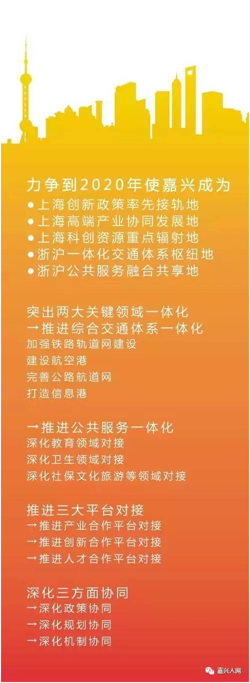 《嘉興市創建浙江省全面接軌上海示范區行動計劃(2017-2020年)》是今后4年內嘉興接軌上海的行動指南。